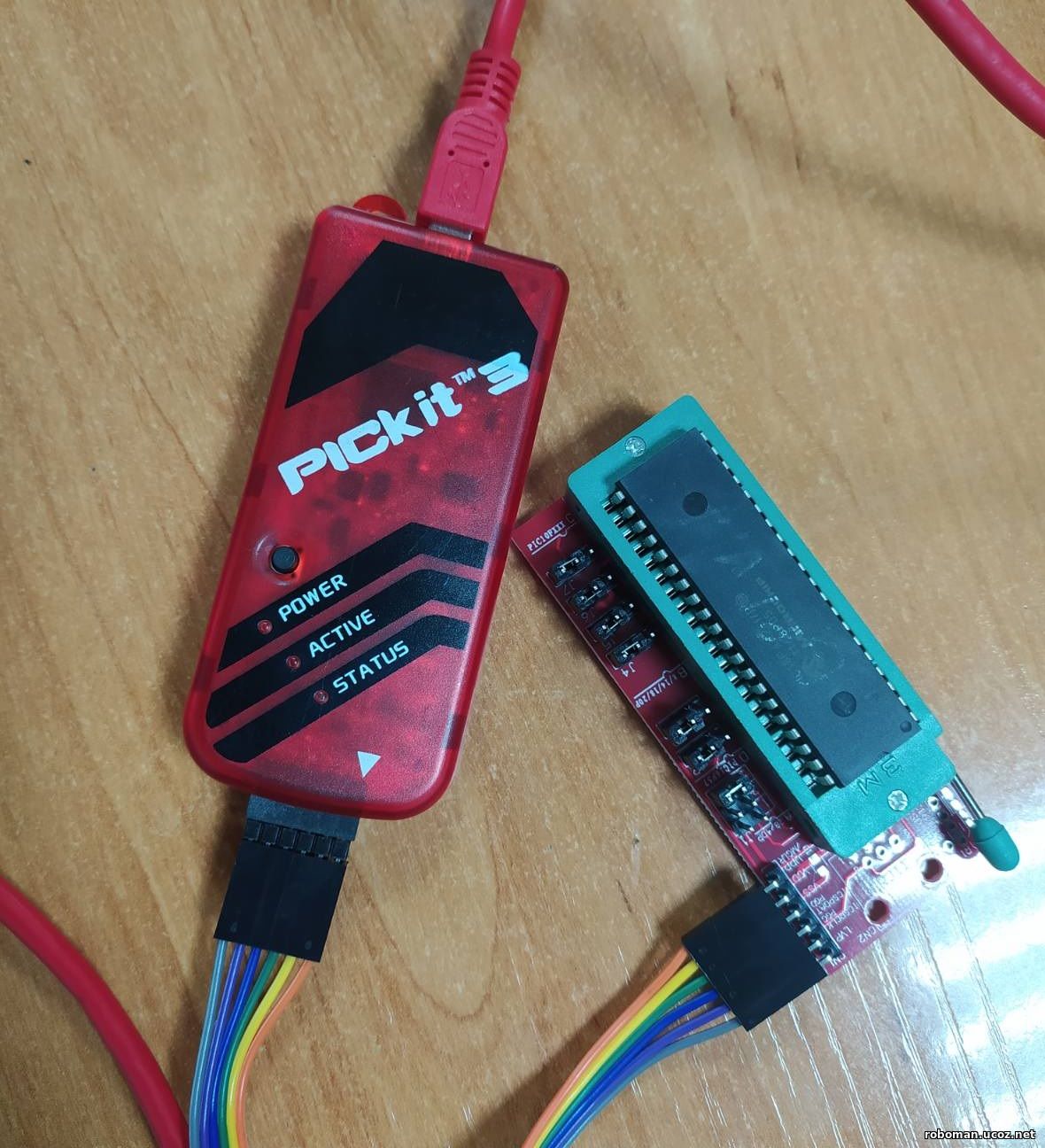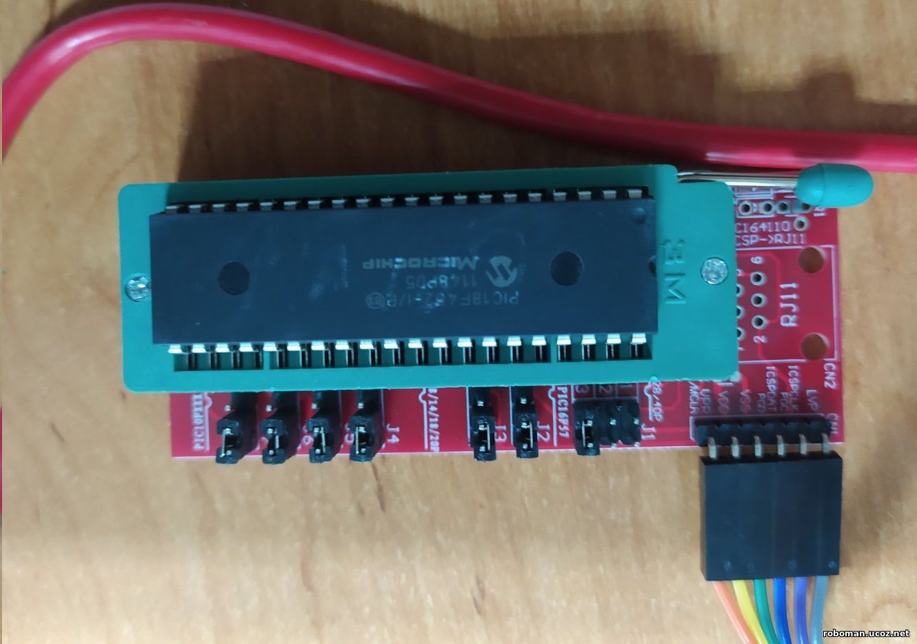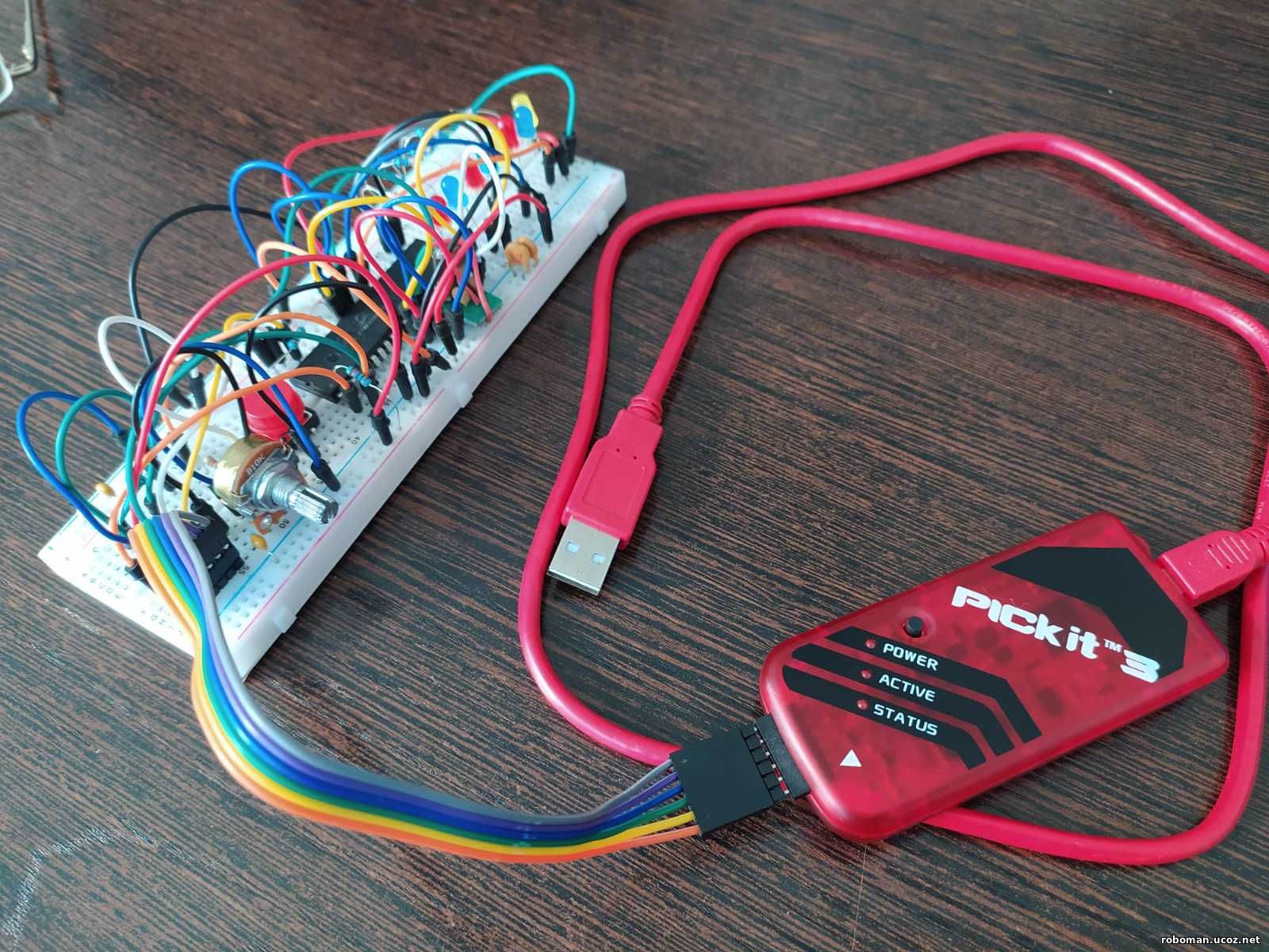 Ниже код исходника pic18f452.c /* Взято из источника : https://pro-diod.ru/programms/pic-micro/acp-v-pic18f45xx-analogo-cifrovoe-preobrazovanie.html?ysclid=m050mtxq8j421044859 *Author: SHRB 01.10.2024 адаптировано для pic18f452, согласно мануала */ #include <xc.h> // можно подключить и #include <pic18f452.h> #include "config_bits.h" // #include "config_sett.h" #define _XTAL_FREQ = 14000000 // частота 14 Мгц unsigned char adresult0 = 0; // переменная для результата младший регистр ADRESL unsigned char adresult1 = 0; // переменная для результата старший регистр ADRESH void main() { // --- это можно переместить в файл config_sett.h --- /// TRISD = 0X00; // D настройка порта на выход - светодиоды TRISB = 0X01; // B настройка порта на вход - кнопки /* настройки для АЦП */ TRISAbits.RA0 = 1; // использование AN0/RA0 как вход ADCON0bits.CHS = 0b00000000; // AN0/RA0 как вход для АЦП ADCON1bits.PCFG = 0b00001001; // опорное напряжение на VDD (+5D), и VSS (GND) - ADCON0bits.ADCS = 0b00000010; // делитель частоты FOSC/64 = 14000000 / 64 = 218.750 кГц ADCON1bits.ADFM = 0; // левое выравнивание результата в регистрах ADCON0bits.ADON = 1; // запуск модуля АЦП // Настройка внешних прерываний INTCONbits.INT0IE = 1; // разрешить прерывание INT0 INTCONbits.INT0IF = 0; // сброс флага прерывания INT0, у этого высокий приоритет всегда INTCON3bits.INT1IE = 1; // разрешить прерывание INT1 INTCON3bits.INT1IP = 0; // приоритет прерывание INT1 - низкий INTCON3bits.INT1IF = 0; // сброс флага прерывания INT1 INTCON3bits.INT2IE = 1; // разрешить прерывание INT2 INTCON3bits.INT2IP = 0; // приоритет прерывание INT2 - низкий INTCON3bits.INT2IF = 0; // сброс флага прерывания INT2 // Настройка фронтов прерываний INTCON2bits.INTEDG0 = 1; // по восходящему фронту INT0 INTCON2bits.INTEDG1 = 1; // по восходящему фронту INT1 INTCON2bits.INTEDG2 = 1; // по восходящему фронту INT2 // Настройки прерываний для АЦП PIE1bits.ADIE = 1; // разрешить прерывание АЦП PIR1bits.ADIF = 0; // сброс флага прерывания АЦП IPR1bits.ADIP = 0; // приоритет прерывания для АЦП низкий // Общие настройки прерываний INTCONbits.PEIE = 1; // разрешить периферийные прерывания INTCONbits.GIE = 1; // разрешить глобальные прерывания RCONbits.IPEN = 1; // разрешить приоритетные прерывания // --- это можно переместить в файл config_sett.h --- /// while(1) //главный цикл { LATD = 0X00; // сброс порта D LATD = adresult1; // запись значения с АЦП в порт - светодиоды } } // обработчики прерываний __interrupt(high_priority) void inter_1 (void) // прерывания высокого приоритета { //--- INT0 ---------------------------------------------- if(INTCONbits.INT0IF == 1) // прерывание INT0 { INTCONbits.INT0IF = 0; // сброс флага ADCON0bits.GO = 1; // запуск преобразования АЦП } } __interrupt(low_priority) void high_isr(void) // прерывания низкого приоритета { PIR1bits.ADIF = 0; // сброс флага adresult0 = ADRESL; // результат АЦП adresult1 = ADRESH; } // if (PIR1bits.ADIF && PIE1bits.ADIE) //--- INT1 ---------------------------------------------- if(INTCON3bits.INT1IF == 1) // прерывание INT1 { INTCON3bits.INT1IF = 0; // сброс флага ADCON0bits.GO = 1; // запуск преобразования АЦП } //--- INT2 ---------------------------------------------- if(INTCON3bits.INT2IF == 1) // прерывание INT2 { INTCON3bits.INT2IF = 0; // сброс флага ADCON0bits.GO = 1; // запуск преобразования АЦП } } // high_priority END Можно конечно файл сделать типа h еще. Например , config_sett.h – в него скопировать все настройки АЦП, прерываний, а его прописать в главном с-файле в виде строки #include "config_sett.h" В файле #include "config_bits.h", тоже подключенном в с-файле находятся настройки битов (конфигурация битов) Как видно из фотографий, программирование производилось программатором PicKit 3, а отладка в среде MPLAB. Удачных повторений и исследований, Умельцы! :)